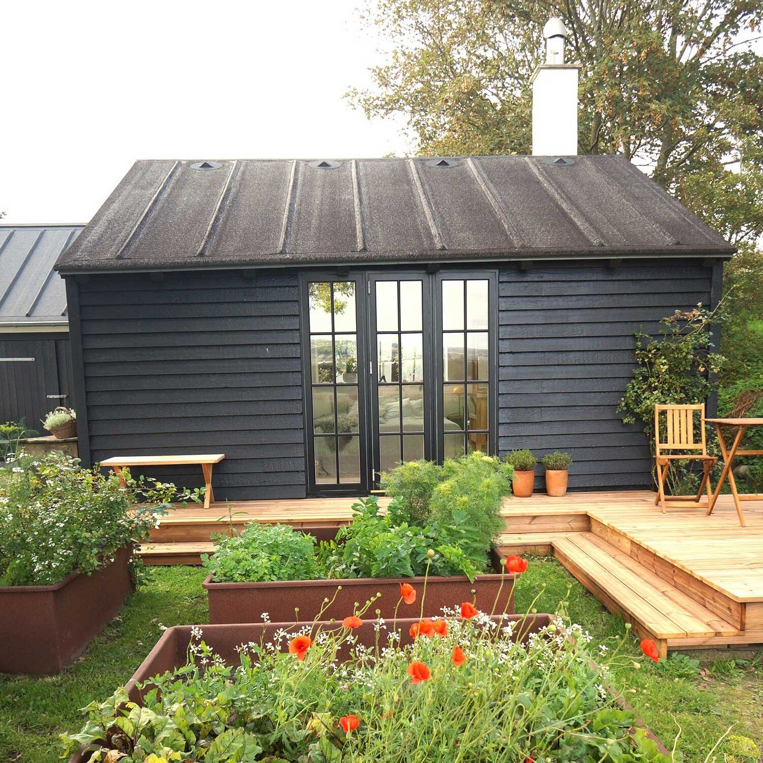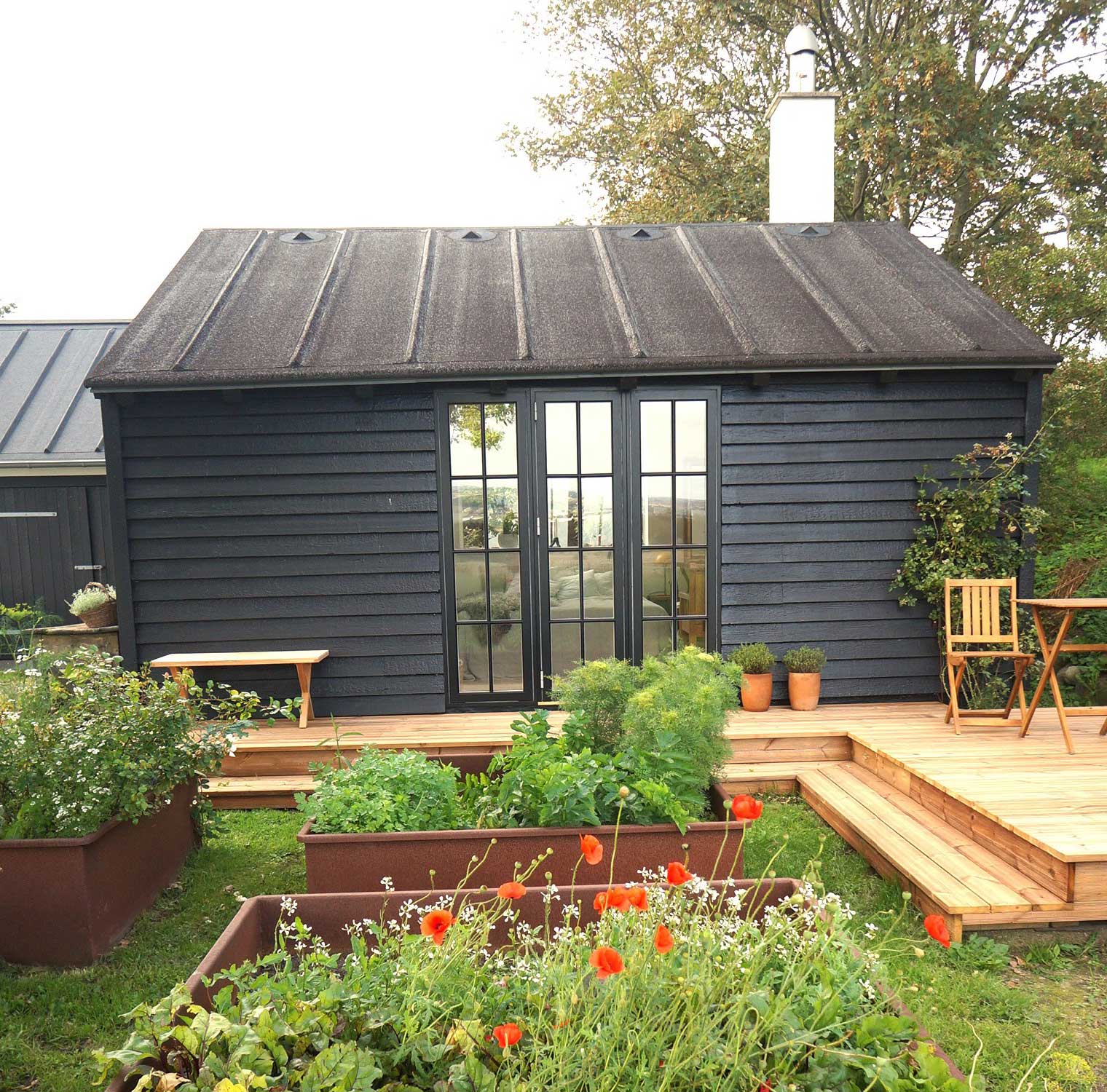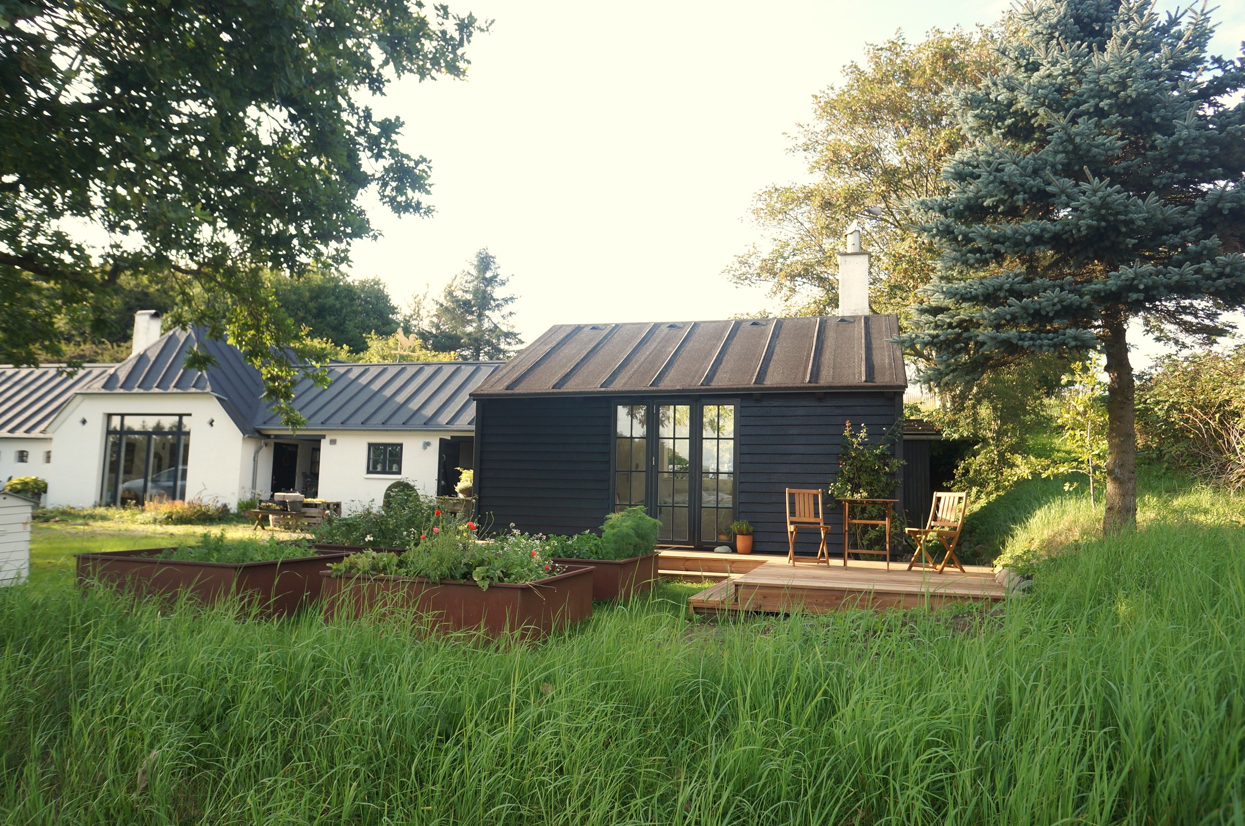 Foran huset ved terrassen mod syd er der en bålplads, krydderurtehave og højbede. – Bag ved huset en gårdhave med højbede, et udendørs køkken og en fint afskærmet udendørs bruser med varmt vand.