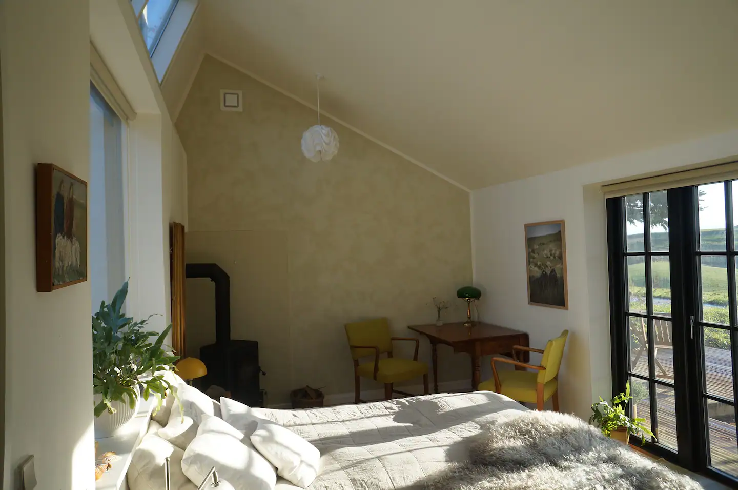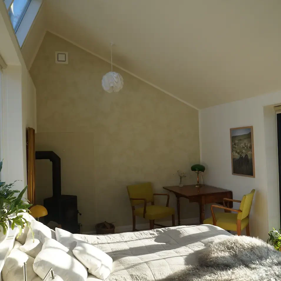 På stjerneklare nætter kan du fra sengen opleve stjernehimlen gennem ateliervinduerne i taget. Om dagen kan du glæde dig over det ganske særlige lys som beliggenheden tæt på fjord og hav kaster over landskabet.