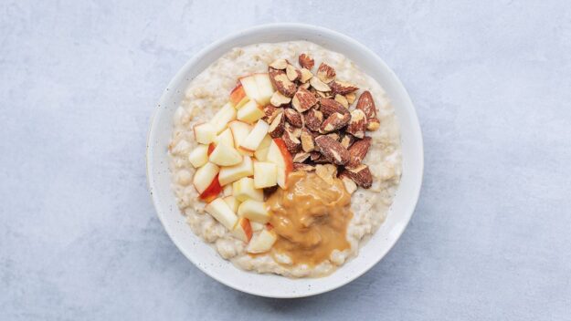 Grovvalset havre kogt på havredrik og vand med 3 valgfrie toppings – lille / stor: 60 / 70 DDK – 8,05 / 9,39 €.